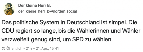 Das festzustellen ist aber auch schon der Beginn, es anders zu machen. Unabhängig davon, ob der Buckelwal bald wieder in den offenen Ozean abtaucht oder präpariert im Ozeaneum Stralsund hängt, wir erleben ein Frühjahr mit Anzeichen eines Wandels zum Positiven: In Ungarn ist die Orbàn-Herrschaft tatsächlich zu Ende gegangen. Trump kann die Tage seiner Macht bis zu den Wahlen im November abzählen und der russische Präsident fürchtet mehr denn je einen Umsturz.